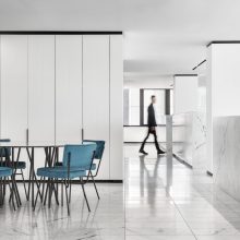 To encourage natural light throughout and access to city views throughout the space a screen divides the public reception area and private work spaces. As a device to bring people together, there is a formal break-out zone at the heart of the office and meeting areas scattered throughout. The open-plan design removes a sense of hierarchy and directors and staff are placed together in ‘neighbourhoods’.